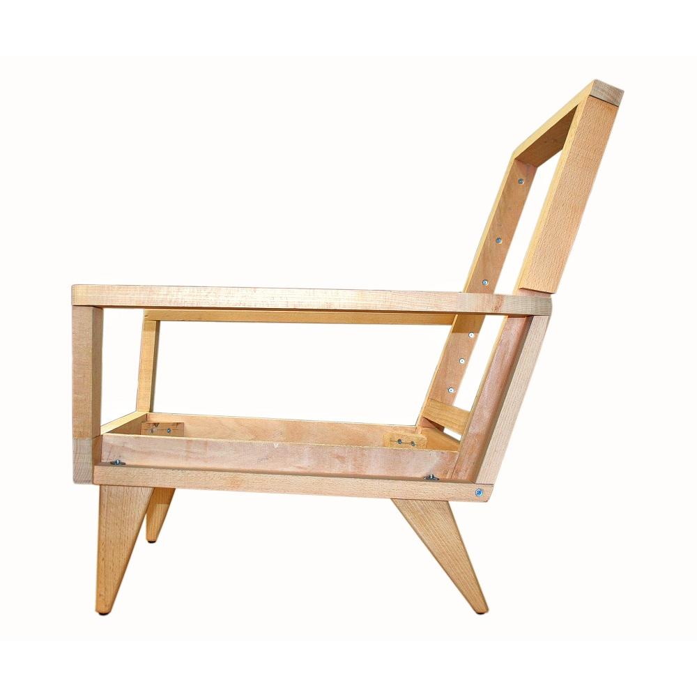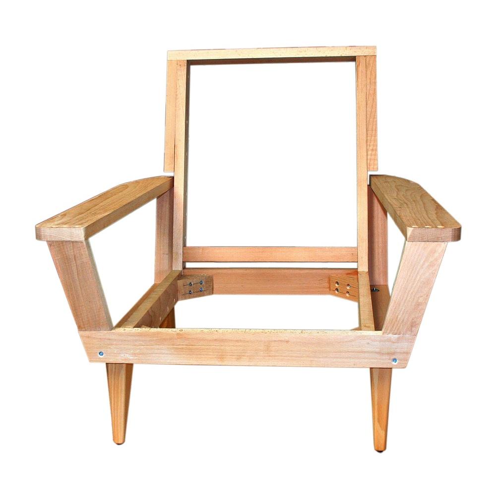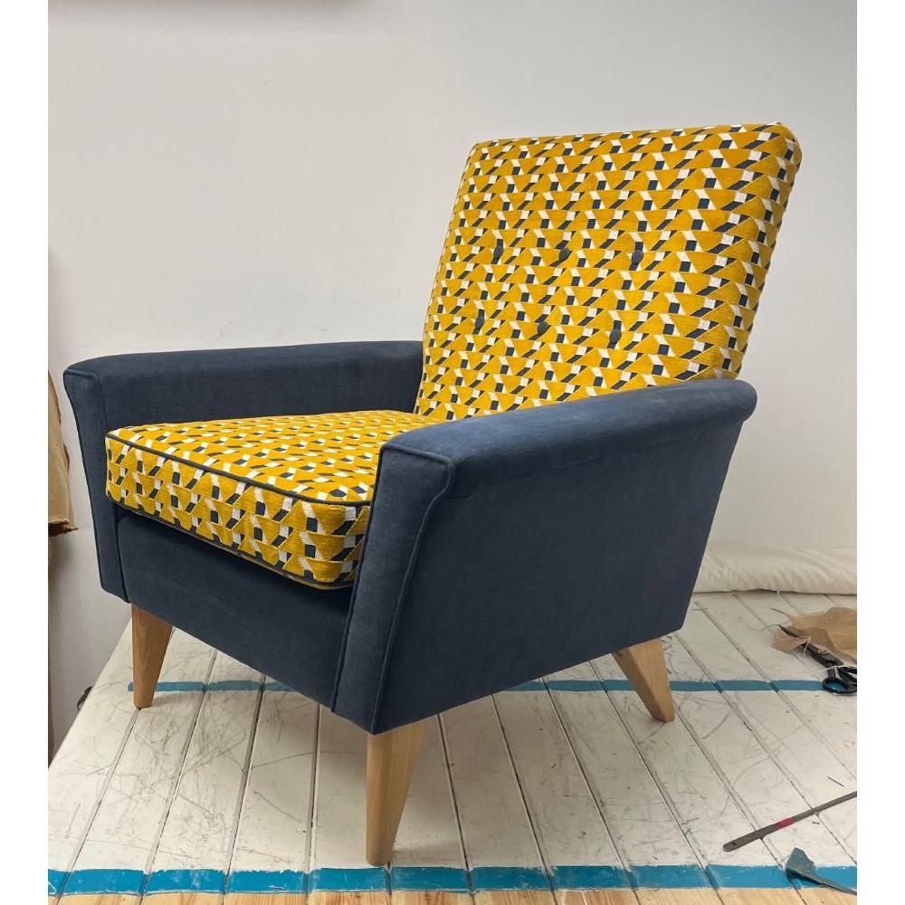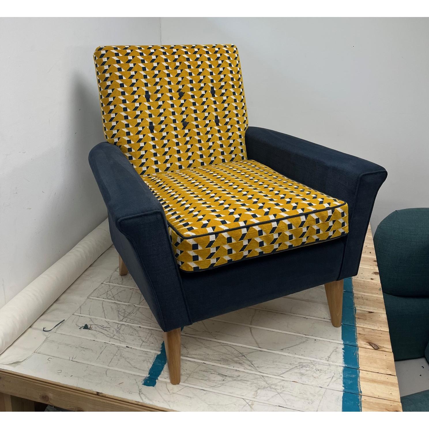 1960's inspired arm chair, hand made and upholstered in yellow and blueberry colours. This is a show piece chair as well as useable.