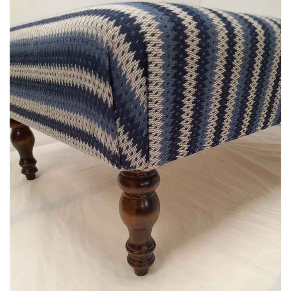 This large handmade footstool measures 24" x 40", stand 15" high on turned dark stained beech legs. The fabric is from Romo, a hard wearing textured weave.