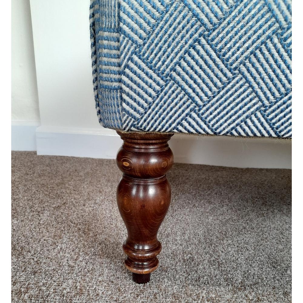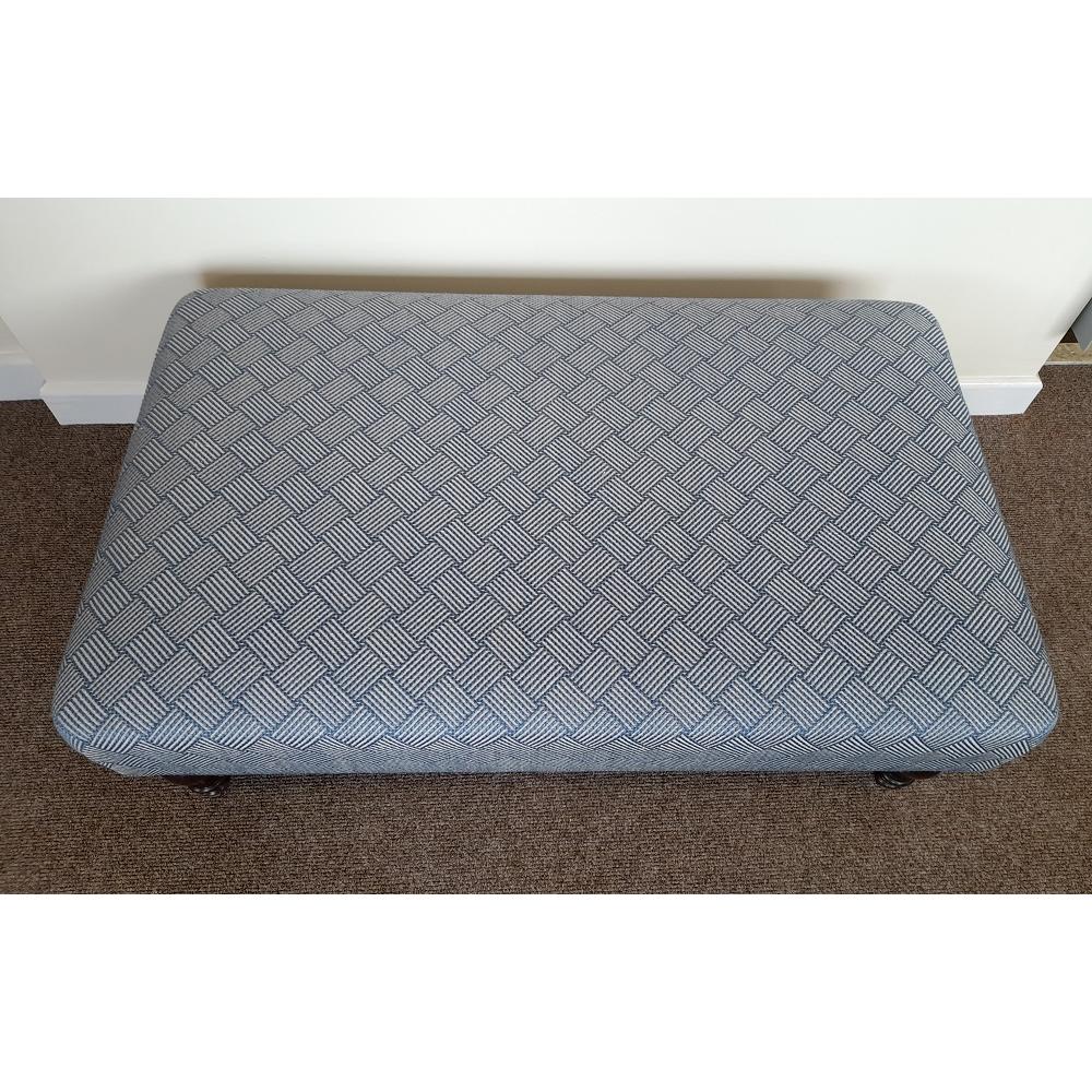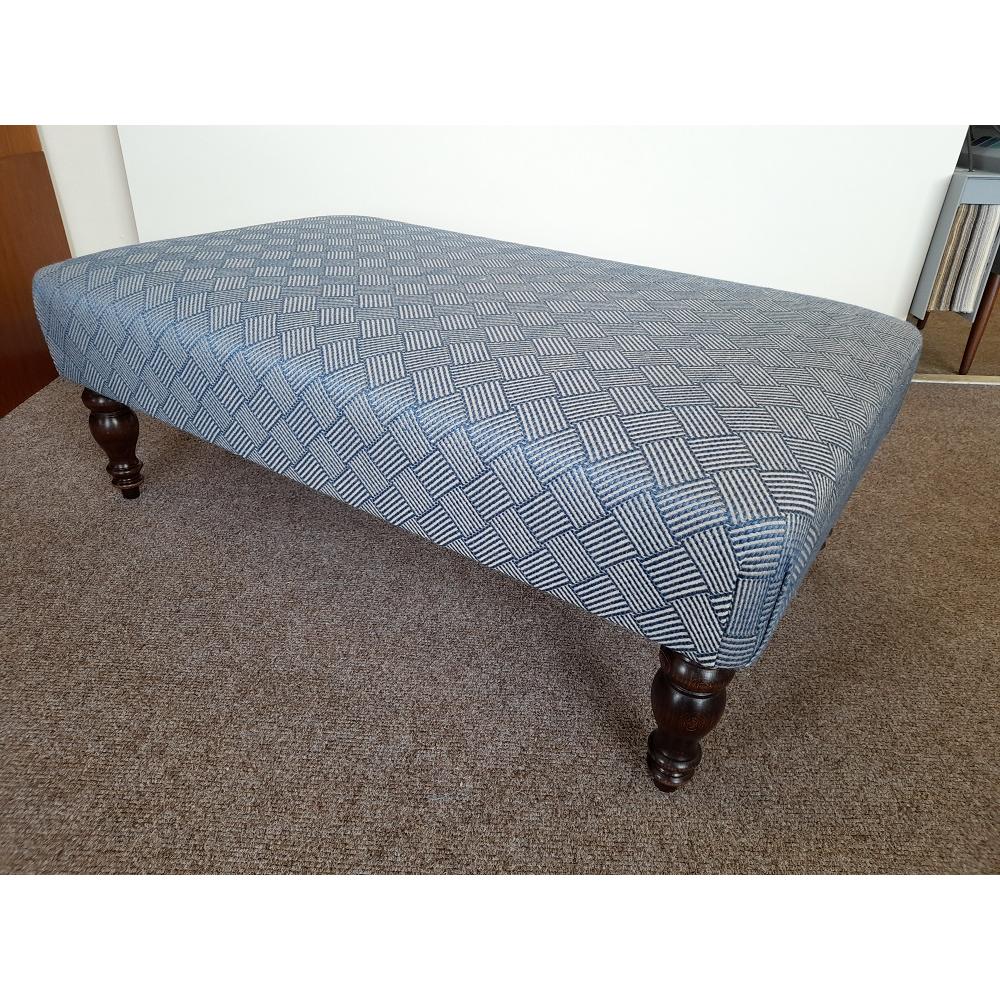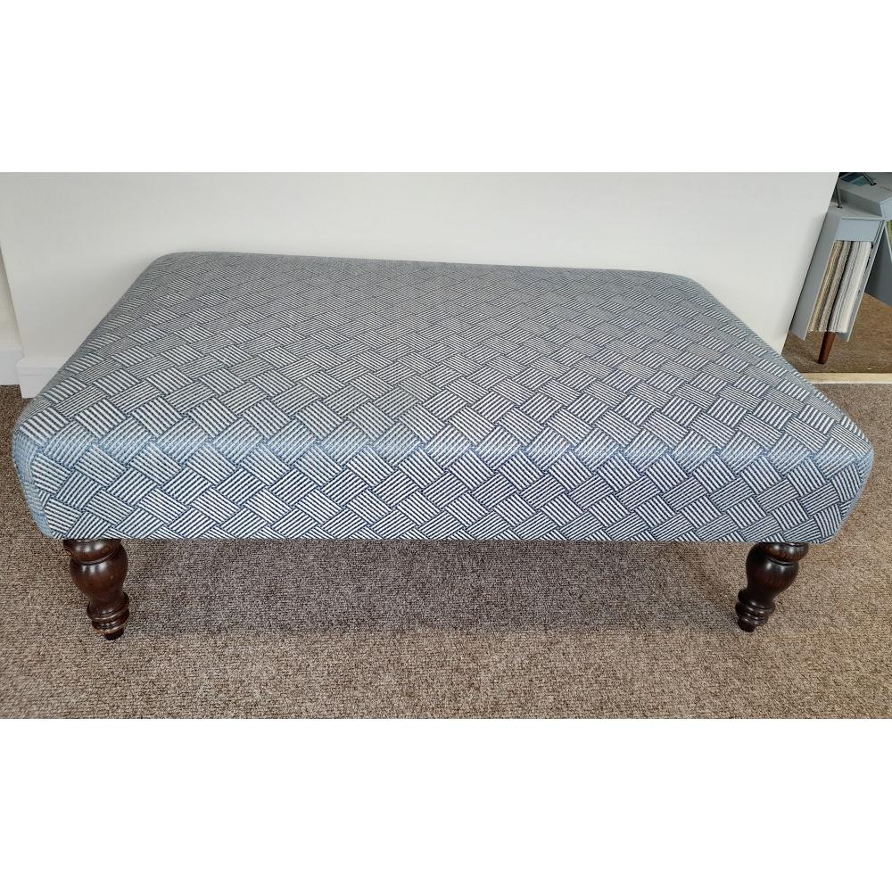 Large footstool measuring 24" x 40" standing 15" high on turned legs upholstered in fabric from Pierre Frey.