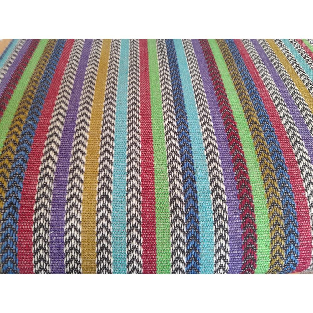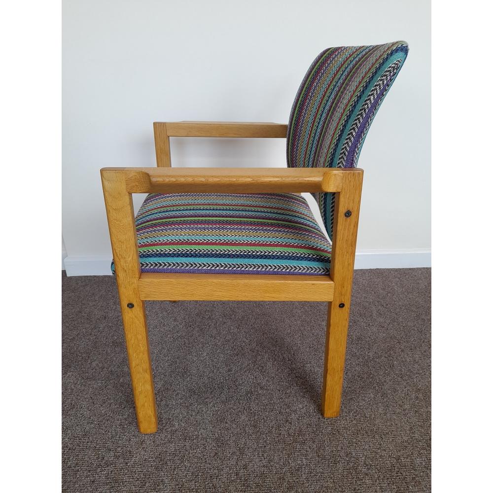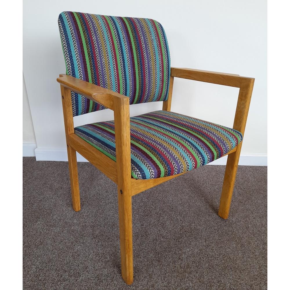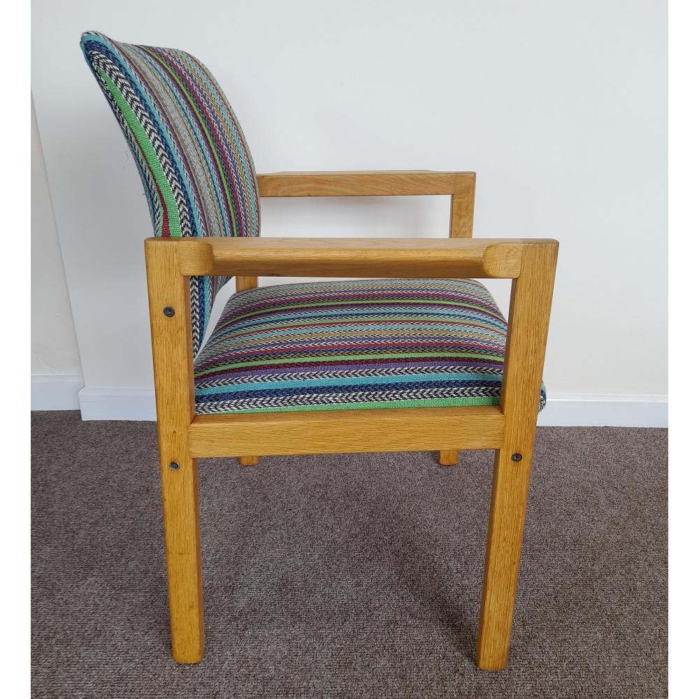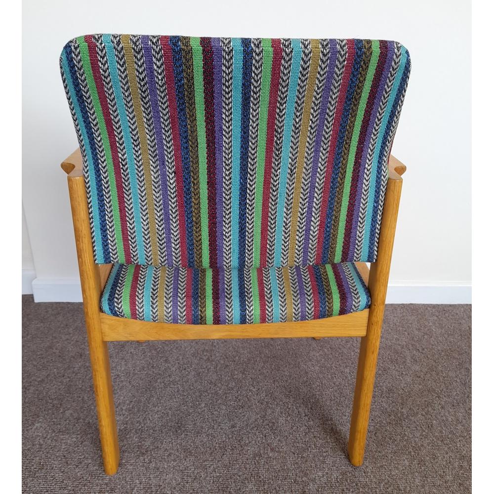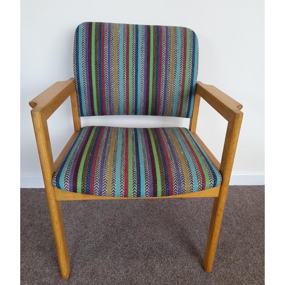 Restored and re-upholstered, Danish oak carver. The oak had been sanded and oiled. All the upholstery has been removed and fully re-upholstered, with a top cover using a stripe from Pierre Frey.