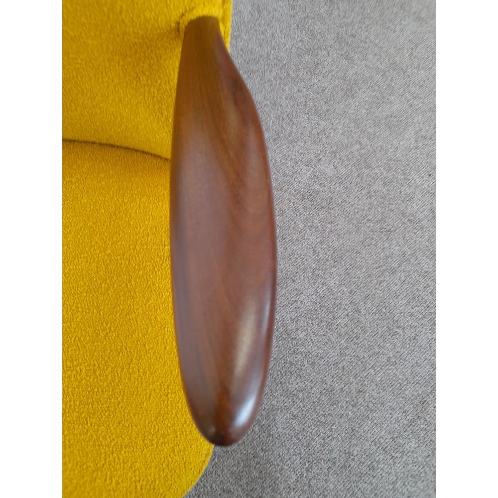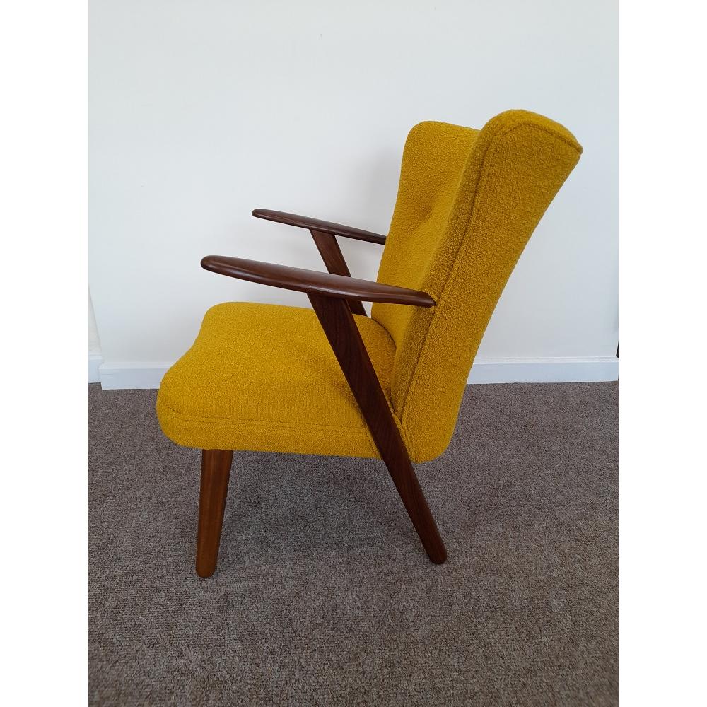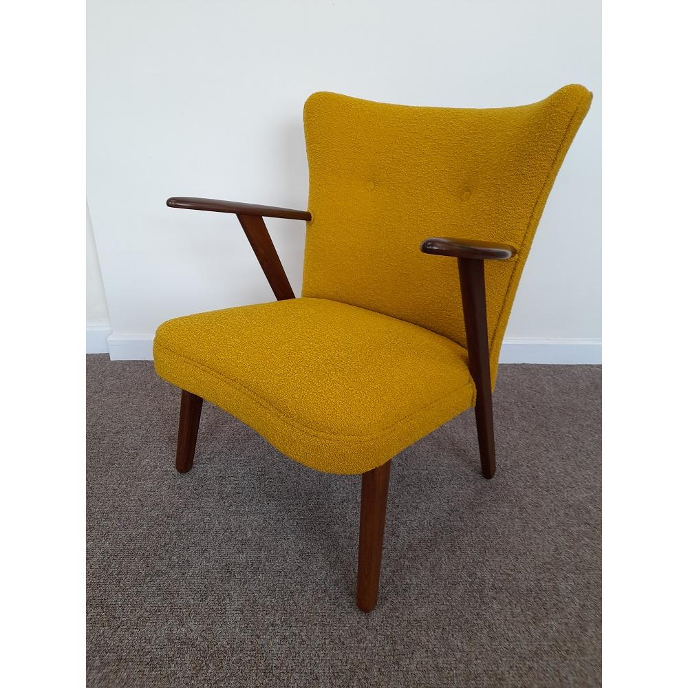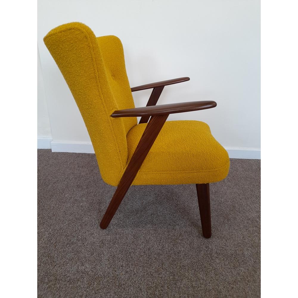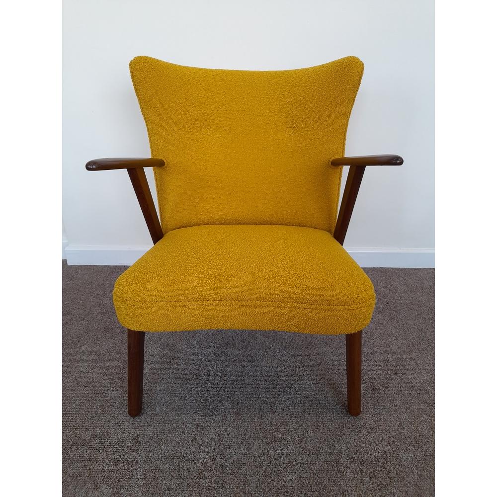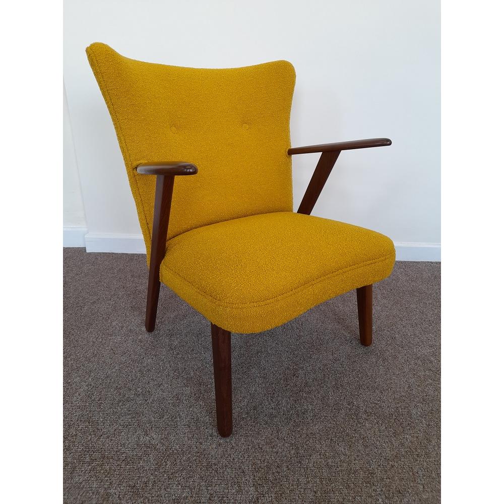 An original Danish teak 1950's arm chair which has been restored and re-upholstered. All the upholstery has been removed, the frame repaired, frame sanded and oiled and new upholstery. The fabric is a boucle wool from Bute fabrics.