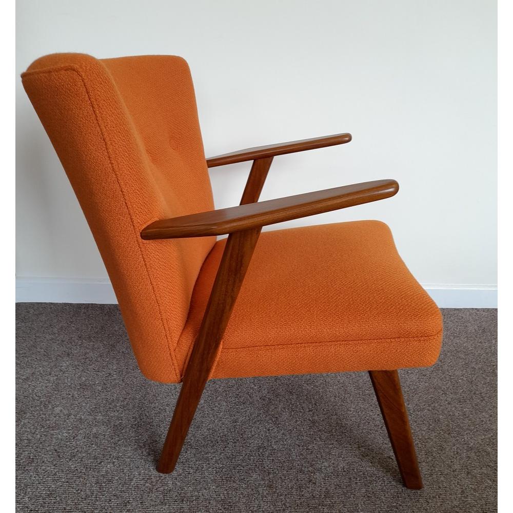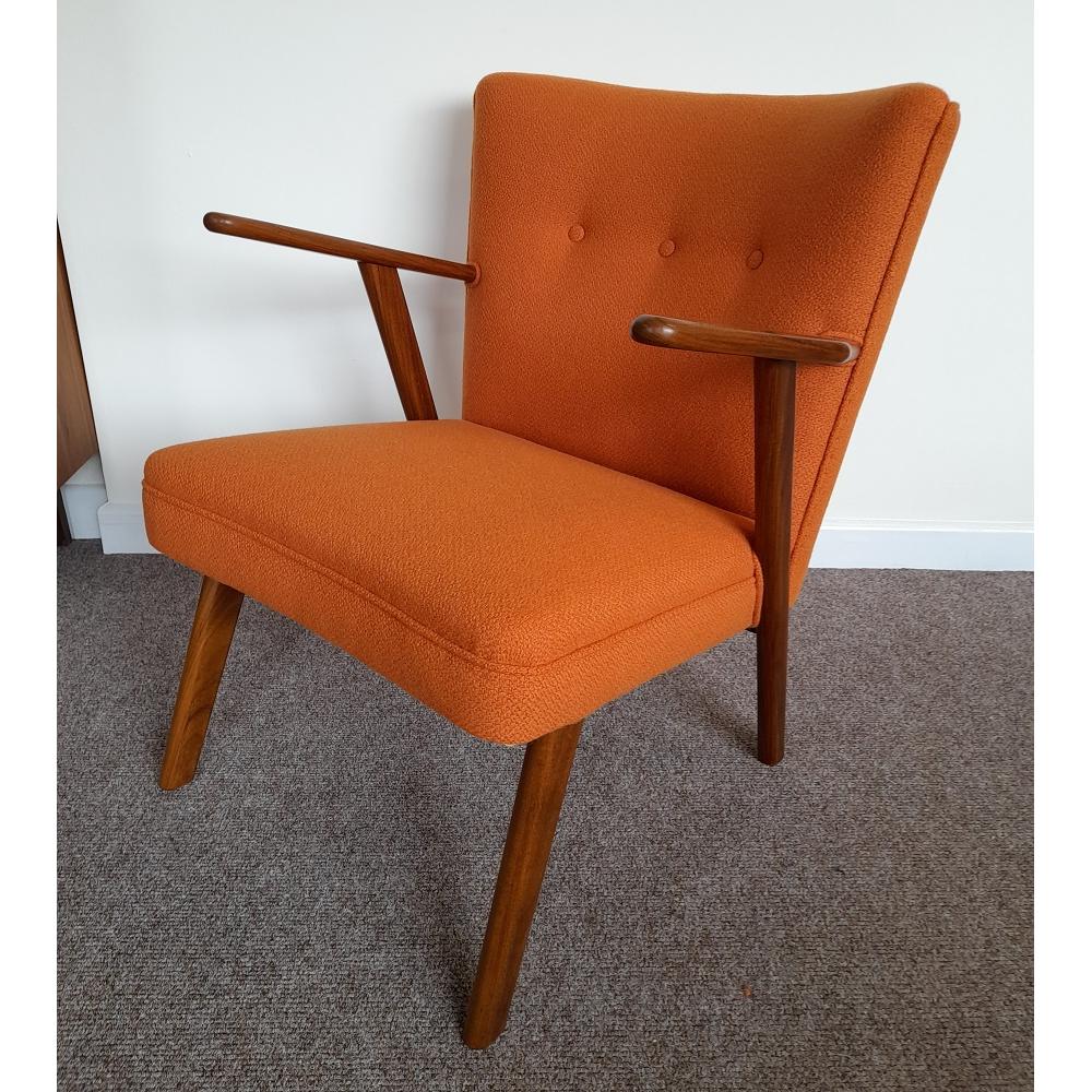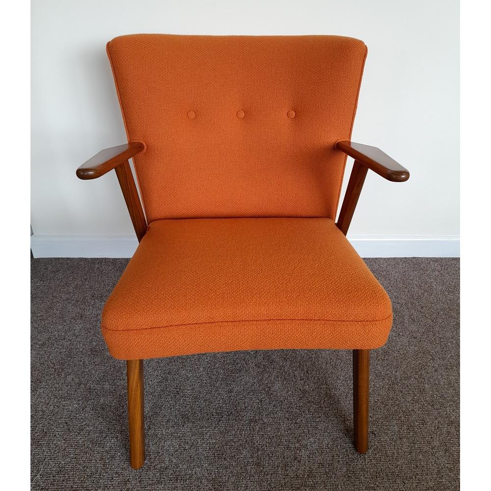 This Danish teak leaning chair has been sanded, oiled and re-upholstered in Bute wool fabric.