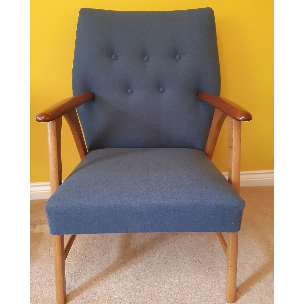 Restored and re-upholstered Danish arm chair, oak frame with teak arm tops, upholster in Scottish wool from The Isle Mill.
