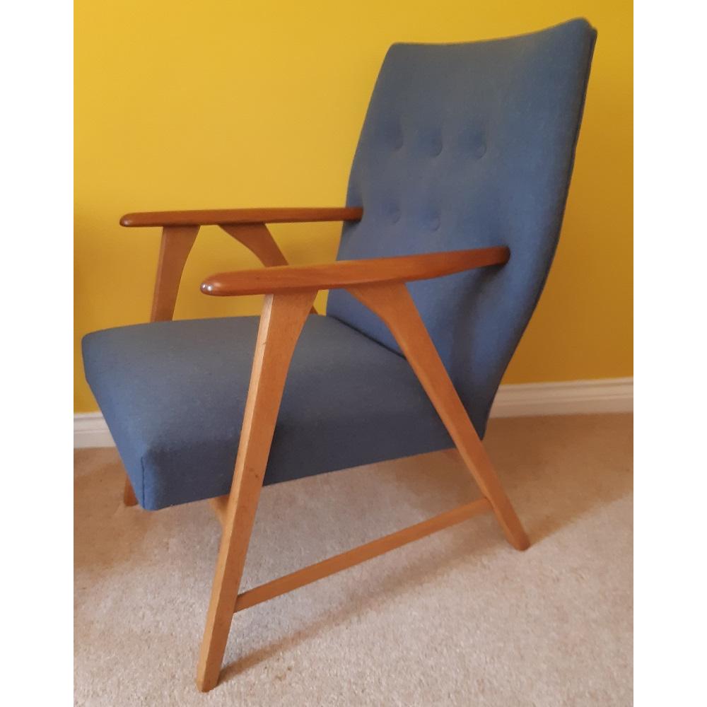 This unusual arm chair is perfect if you have a small space. The old upholstery has all been removed, the woodwork sanded and oiled with a wax oil to protect the wood and bring out the natural grain. A webbed seat, high density foam for comfort and a soft Merino wool to finish.