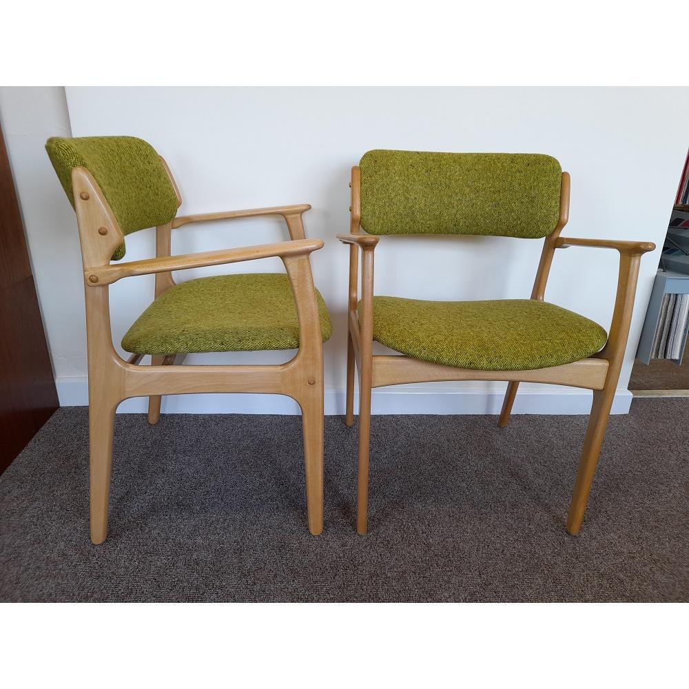 A pair of beech carvers by Danish designer Erik Buch. These chairs were designed by Erik Buch in 1949, hence model 49 chair.